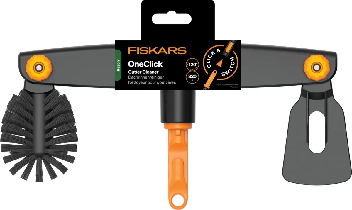 A Fiskars OneClick ereszcsatorna-tisztító a tetőcsatornák hatékony karbantartására szolgál, közvetlenül a talajról. Egyesíti magában a durva és lerakódott szennyeződések eltávolítására szolgáló kaparót és a végső tisztításhoz szükséges lekerekített kefét. A OneClick állítható szögű munkafeje és teleszkópos nyele segítségével gyorsan és a létrán való munkavégzéssel járó kockázatok nélkül tisztíthatja meg az ereszcsatornákat.