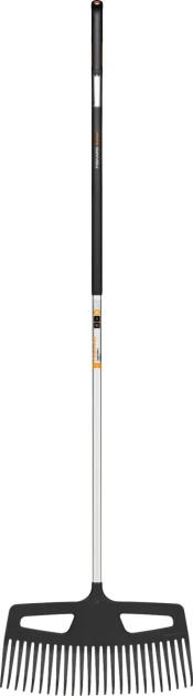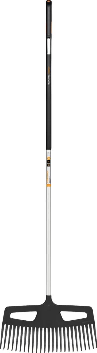 Széles gereblye rugalmas ujjakkal a nagy területeken történő hatékony levélgereblyézéshez. Tartós és egyben könnyű, edzett alumíniumból készült nyél a kert egyszerű, erőfeszítés nélküli takarításához. A nyél fogási pontján kényelmes Softgrip™ felület található. Praktikus tárolónyílás