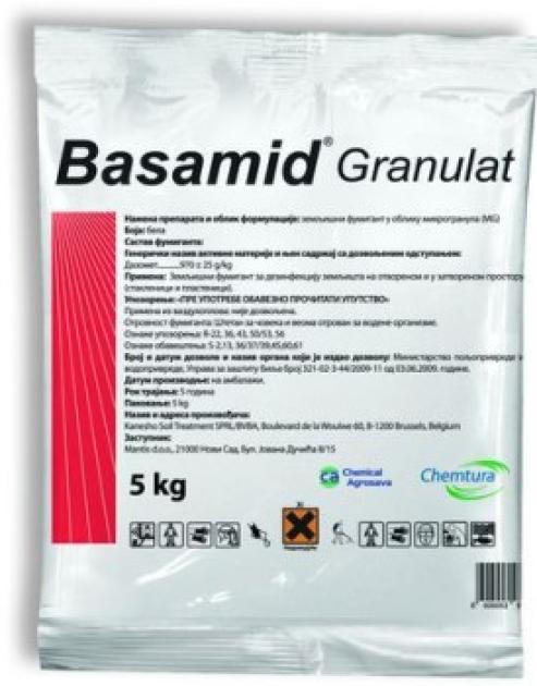 vagy mész. Fertőtlenítéskor a terméket egyenletesen terítsük szét a talaj felszínén (szórógéppel, kézzel), és azonnal dolgozzuk be a kívánt mélységig, majd a felületet egyengetjük vagy enyhén hengereljük. A megfelelő talajnedvesség biztosítása érdekében a kijuttatás után 3-5 nappal a száraz talajt a szükséges nedvesség eléréséig megszórjuk. Ennek fenntartása és a Basamid hatékonyságának növelése érdekében célszerű a kezelt területet 5-7 napig ponyvával, műanyag fóliával stb. letakarni.