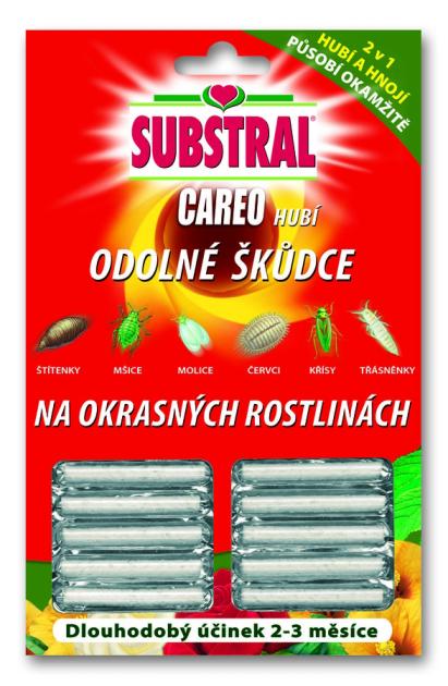 - A Substral CAREO kártevőirtó pálcikák olyan kártevőirtó pálcikák, amelyek akár 10 hétig is védelmet nyújtanak a dísznövényeknek a levéltetvek, molyok, pajzstetvek, tripszek és férgek ellen. A pálcikák kettős hatást fejtenek ki: a növényeket tápanyaggal látják el a növekedéshez, ugyanakkor elpusztítják a kártevőket, és ellenálló védelmet nyújtanak a növényeknek az újrafertőződés ellen. Alkalmasak a hidrokultúrában termesztett növények kártevőirtására. A hatóanyagot a gyökereken keresztül veszik fel és az egész növényben eloszlik. A kártevőket szívogatással pusztítják el.
