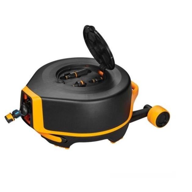 - Tartalmaz egy kiváló minőségű, automatikusan behúzható öntözőtömlőt, egy állítható öntözőfúvókát és a szükséges tömlőcsatlakozókat.